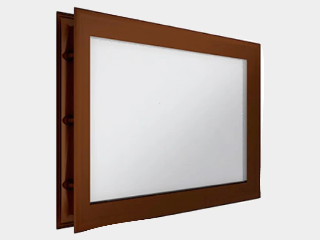 Окно акриловое 452 × 302, коричневое (арт. DH85631). Специальная конструкция обеспечивает плотное прилегание к полотну ворот, что защищает его от промерзания и теплопотери. Окантовка коричневого цвета.